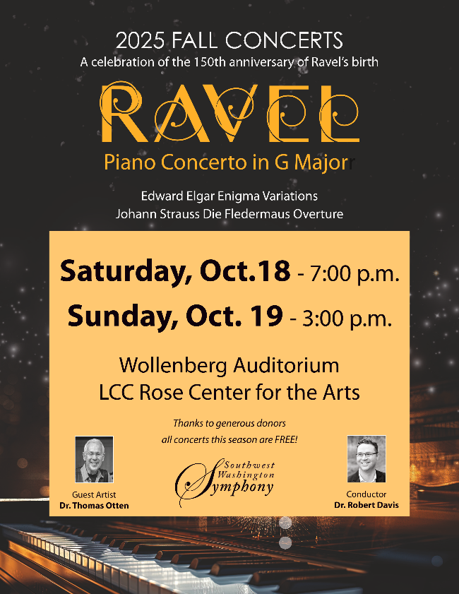 Held at LCC's Wollenberg Auditorium, these season opening concerts will celebrate the 150th anniversary of Ravel's birth with his Piano Concerto in G major and his songs on the legendary Don Quichotte, as well as Edward Elgar's beloved "Enigma" Variations.