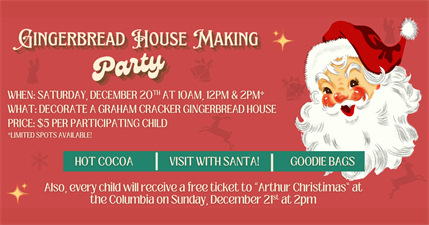 HOT COCOA! GOODIE BAG! VISIT WITH SANTA! Also, every child will receive a FREE TICKET to “Arthur Christmas” showing at the Columbia on Sunday, December 21, 2025 at 2pm!
