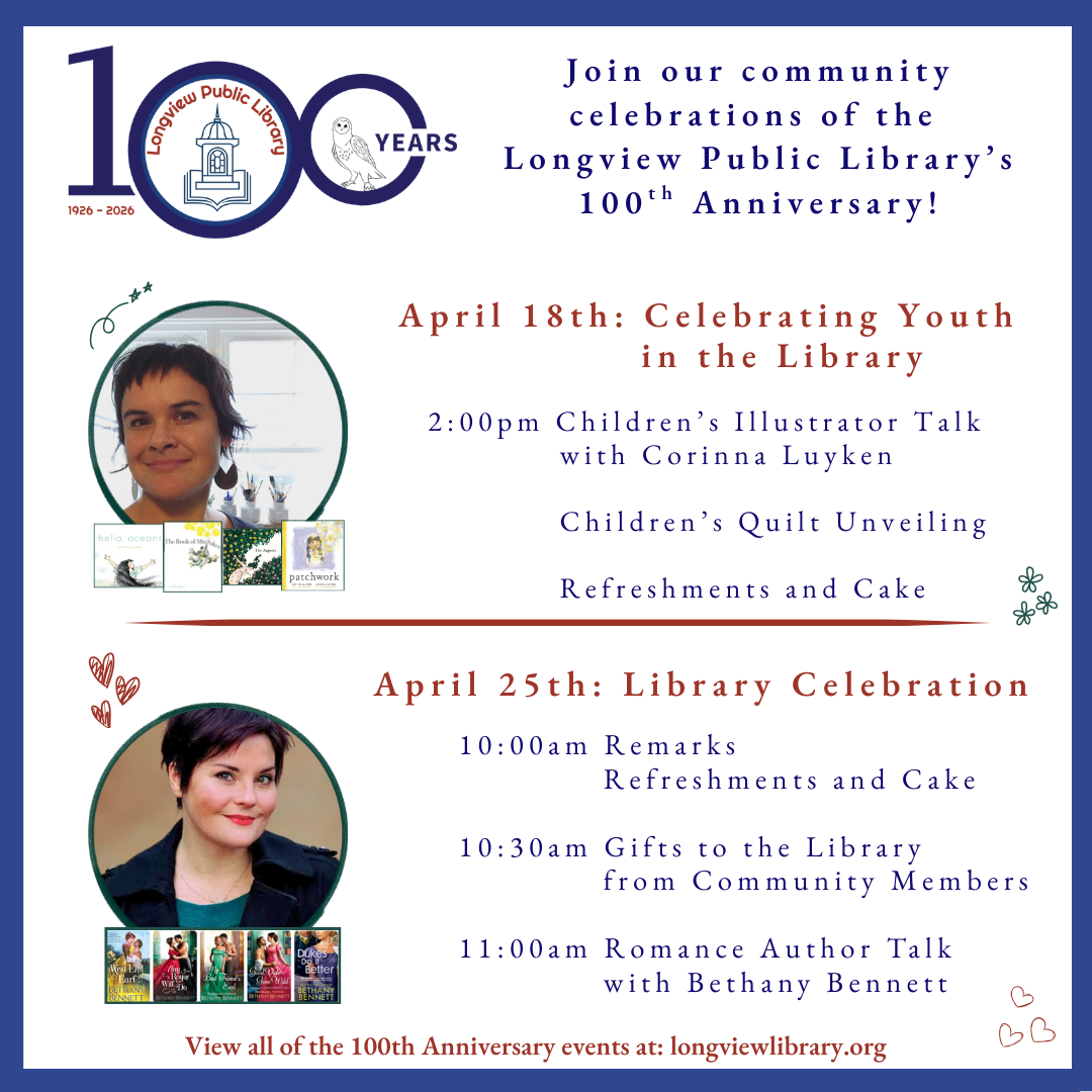 Join us as we celebrate a century of community, stories, and shared knowledge. For 100 years, Longview Public Library has been a cherished gathering place where neighbors discover new worlds through books, connect with one another, and build brighter futures together.