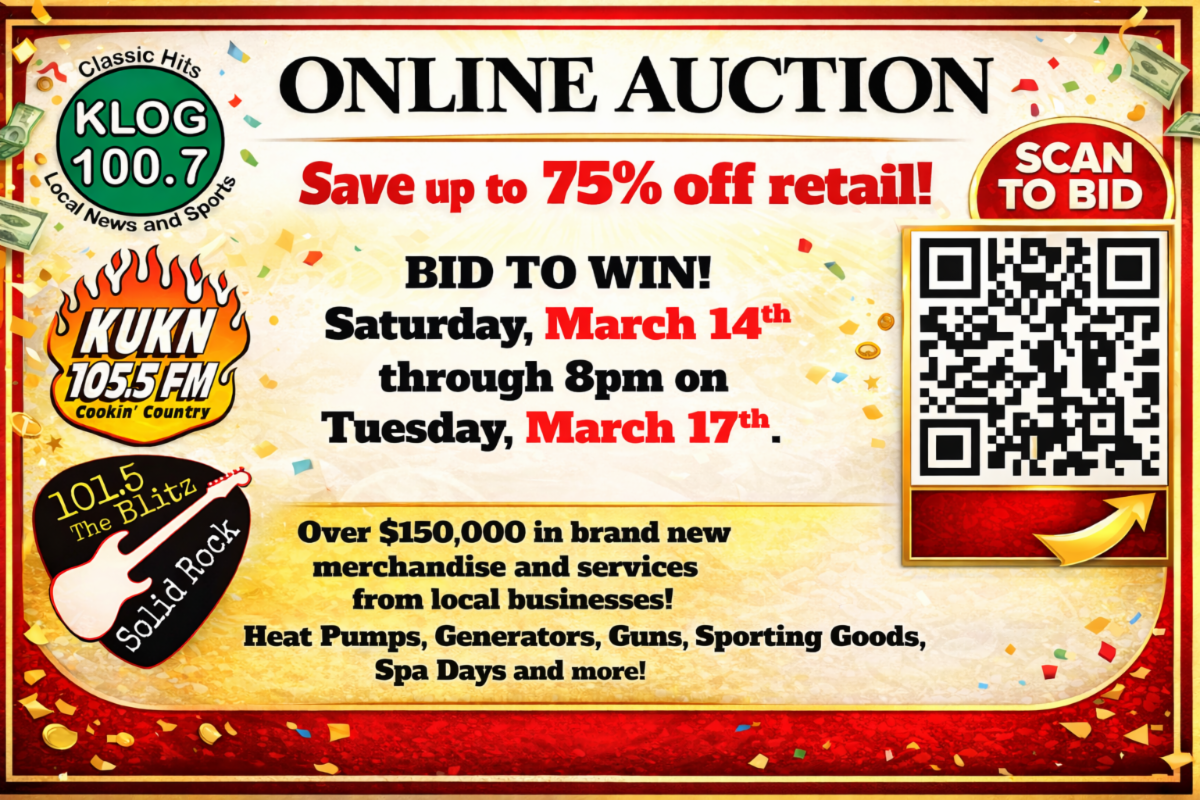Online Auction - KLOG/KUKN/The Blitz/KRKZ Online Auction - KLOG/KUKN/The Blitz/... Set a Reminder Enter your email address below to receive a reminder message. Email address Select the amount of Days before the event -- Select Days Before Event -- 1 Day 2 Days 3 Days 1 Week Captcha Validation Please complete the Captcha Submit Date and Time Saturday Mar 14, 2026 Tuesday Mar 17, 2026 Website Place Bid Here Set a Reminder Enter your email address below to receive a reminder message. Email address Select the amount of Days before the event -- Select Days Before Event -- 1 Day 2 Days 3 Days 1 Week Captcha Validation Please complete the Captcha Submit Share × Print Email Add to Calendar Facebook Twitter LinkedIn Tell a Friend × Select Calendar Type × Google Yahoo iCal (Outlook, Apple, or other)