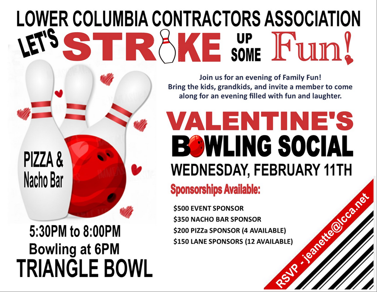 “Let’s Strike Up Some Fun!” at our Valentine’s Bowling Social hosted by Lower Columbia Contractors Association. Join us for an evening of family-friendly fun filled with laughter, bowling, and great food. Bring the kids, grandkids, and invite a member to come along!